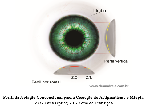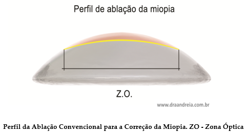 O perfil da ablação convencional para a correção da miopia, portanto, será uma lente com o formato de uma calota esférica circular, em que a parte central é mais espessa e essa espessura vai diminuindo à medida que se aproxima da periferia até chegar a zero na borda. Como esta borda termina em zero, não há necessidade de zona de transição.