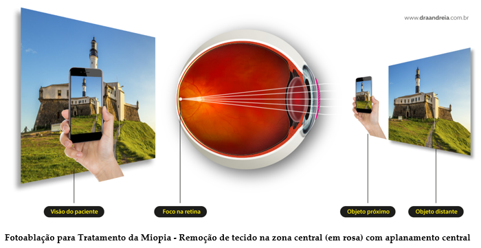 O aplanamento resultante da córnea com a cirurgia deixa a córnea distante da retina na medida necessária para que o raio de luz atravesse o olho e seja focalizado no plano da retina, permitindo a correção da miopia e a nitidez da visão sem óculos.