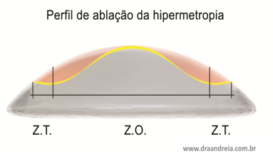 O perfil da ablação convencional para a correção da hipermetropia, portanto, é um perfil complementar ao da miopia. A espessura da ablação é maior na periferia e menor no centro desta lente. Para eliminar o efeito da borda deste perfil, remove-se um pouco mais de tecido em direção à periferia para suavizar o degrau, com a zona de transição.