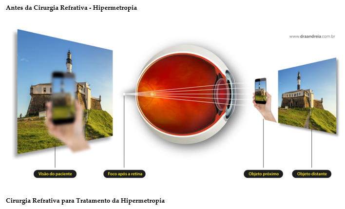 O encurvamento central resultante da córnea com a cirurgia deixa a córnea distante da retina na medida necessária para que o raio de luz atravesse o olho e seja focalizado no plano da retina, corrigindo a hipermetropia e permitindo a nitidez da visão sem óculos.