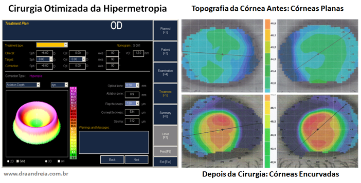Na correção da hipermetropia, segundo a Lei das Espessuras do Prof. Dr. José Barraquer, o excimer laser precisa remover tecido na periferia da córnea, o que proporciona o aumento da curvatura da córnea na área central.