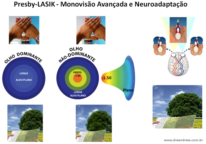Pela alta capacidade de Neuroadaptação e Plascticidade Neuronal, o Sistema Visual Cerebral escolhe a melhor imagem para longe, do olho dominante e a melhor imagem para perto, do olho não-dominante para formar a visão binocular, realizando o mecanismo de fusão das imagens, permitindo que o paciente veja bem para longe e para perto, sem óculos.