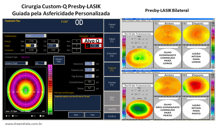 No entanto, a principal indicação da Cirurgia Refrativa Personalizada ou Customizada guiada pela Asfericidade da córnea – Custom-Q é para o tratamento da Presbiopia ou Vista Cansada denominado Presby-LASIK.