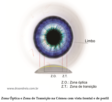 A Zona Óptica é a área circular central da córnea em que o laser atua para realizar o padrão da ablação da correção refrativa (polimento da córnea), enquanto a Zona de Transição é a área em forma de anel para suavizar a curvatura da córnea entre a área tratada e a não tratada.